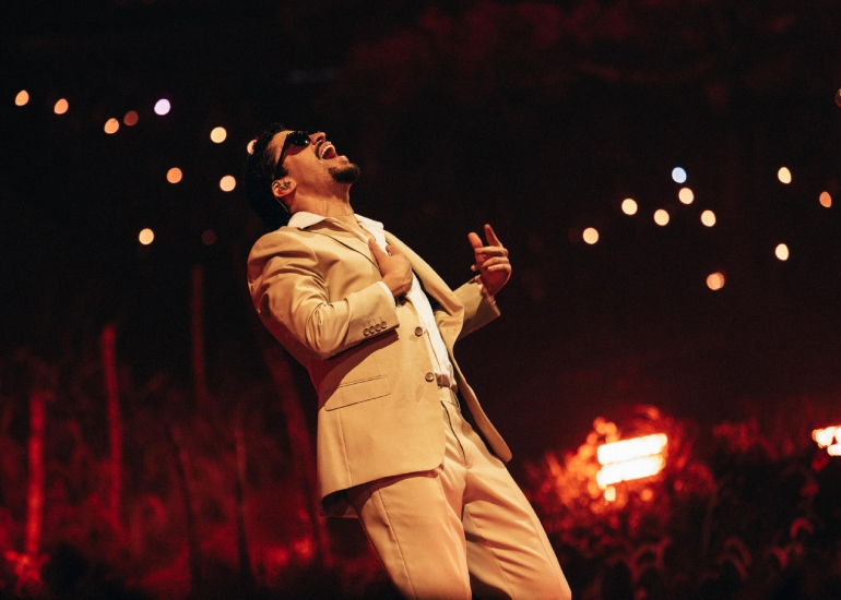 Bad Bunny en acción en su residencia musical "No me quiero ir de aquí" (Hispanic Post).