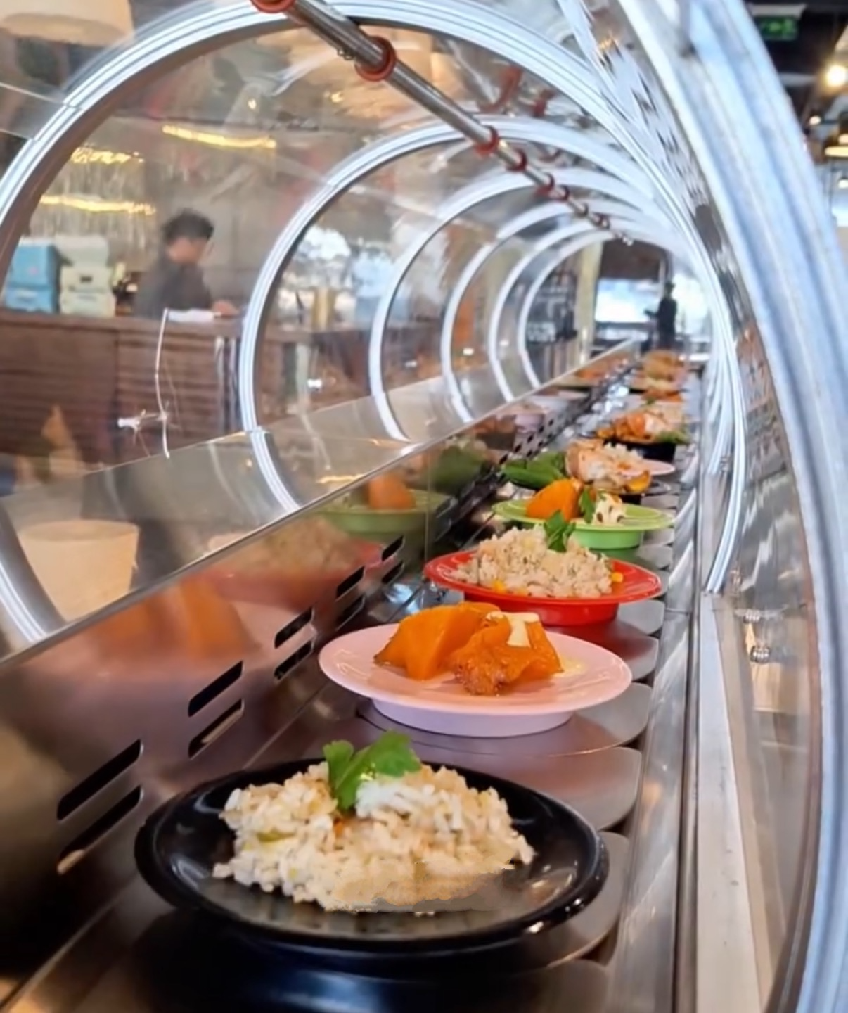 La cinta presenta una diversidad de opciones en sus dos niveles. En la parte superior circulan las preparaciones calientes, incluyendo verduras salteadas, carnes y pescados. El nivel inferior transporta los platos fríos, como las variedades de sushi, nigiri y sashimi recién elaborados, además de tofu y ensaladas frescas.