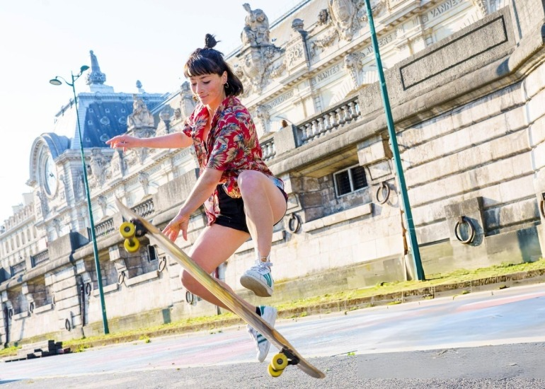 La francesa Cassandre Lemoinef en acción con su longboard (Getty Images).