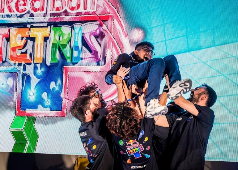 El festejo de Leo Solórzano con los representantes latinoamericanos en la Final Mundial de Red Bull Tetris (Red Bull).