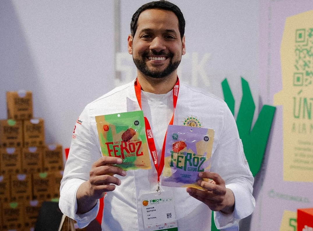 Marcos Somana, fundador de Feroz Snack, con su producto estrella: el Charqui vacuno y de cerdo.