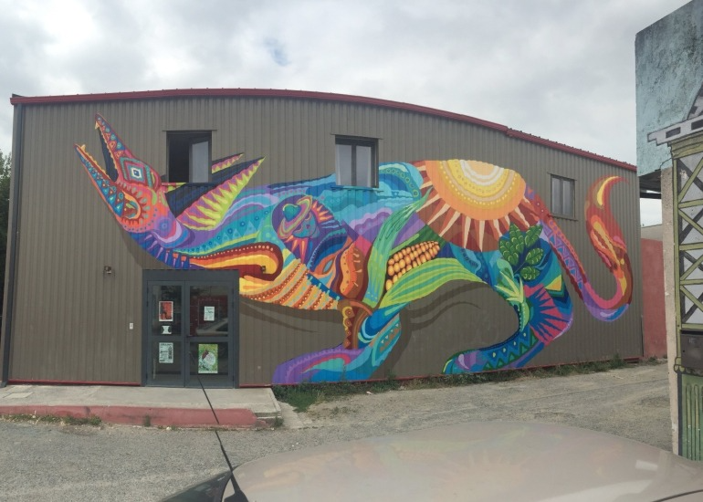Otra obra que se ha convertido en un emblema del portafolio internacional del artista colombiano es el mural “Coyote”. Ubicado en la ciudad francesa de Toulouse y realizado en el marco de Latino Graff, una reconocida muestra de arte urbano latinoamericano, la intervención representa la figura de un coyote compuesta por una explosión de colores intensos y patrones geométricos que se entrelazan a lo largo de su cuerpo en tonos vibrantes de azul, violeta, rojo, naranja, amarillo, verde y turquesa.