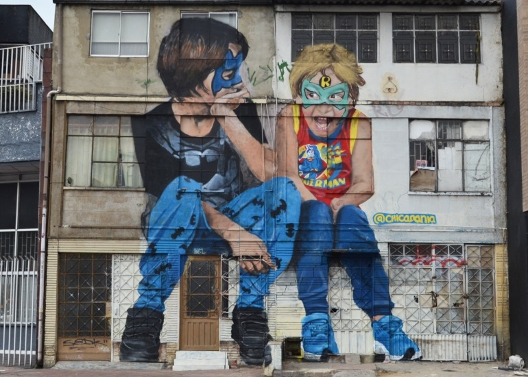 La obra “Brothers” es una de las intervenciones más emblemáticas de la nacida en París en suelo colombiano. Ubicada en la ciudad de Bogotá, la pieza representa la figura de sus hijos, Ian y Marc, y demuestra a la perfección el estilo distintivo de la muralista: uno vestido con ropa identificada con Batman y un antifaz de color azul y otro con una máscara en honor a Robin y una camiseta de Superman.