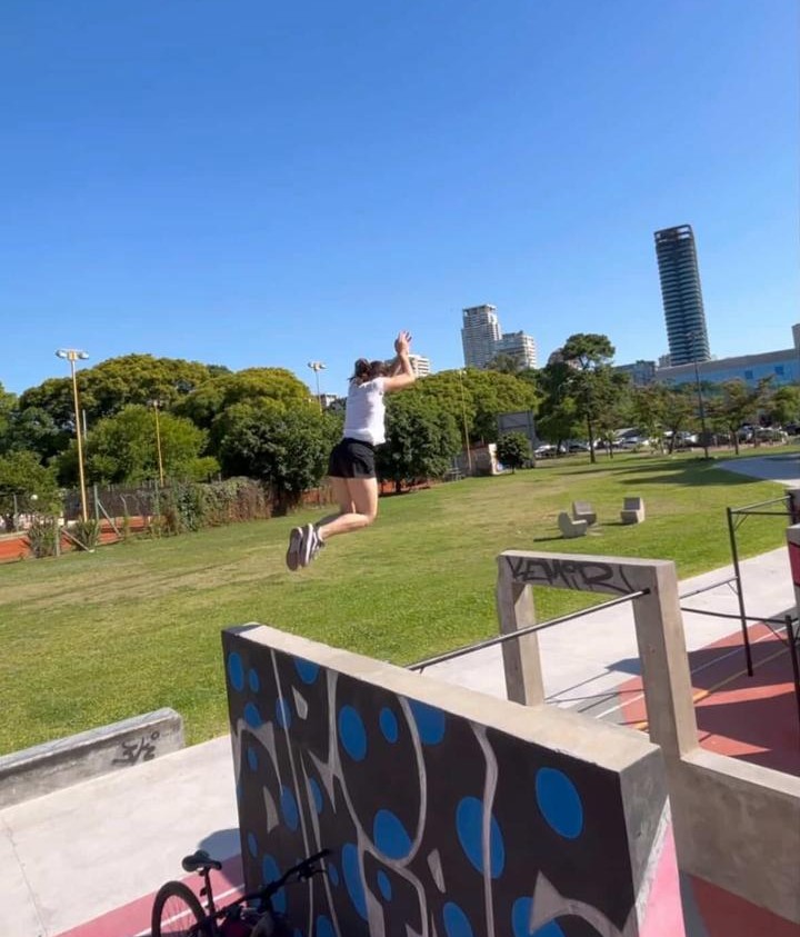 “Cada vez hay más mujeres animándose a probar la disciplina y eso está buenísimo. Antes era muy raro cruzarse con otra chica que practicara el deporte y ahora me encuentro con un montón y es bueno ver como se suman a eventos y se animan a probar cosas más complicadas superándose día tras día”, señala la argentina sobre el papel de las mujeres dentro de la escena del parkour.