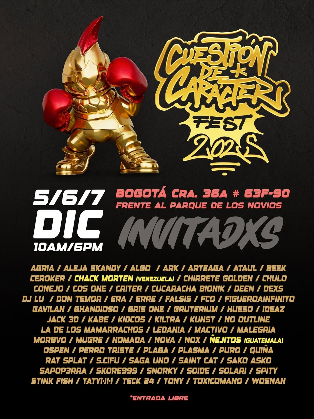 Con sede frente al Parque de los Novios (Cra. 36a # 63f-90) y fecha para el fin de semana del viernes 5 al domingo 7 de diciembre, el festival Cuestión de Carácter se prepara para hospedar uno de los movimientos artísticos más destacados del calendario en Bogotá: la pintada de un muro de la mano de los caracteres más representativos de la capital y sus ciudades vecinas. Con la presencia de más de 250 artistas urbanos, donde se destacan nombres nacionales como Beek, Ceroker y Gruterium y figuras internacionales de la talla de Chack Morten de Venezuela y Ñejitos de Guatemala, el evento busca homenajear y celebrar los personajes que forjaron la identidad artística de las calles de la capital a través de un muro colectivo.