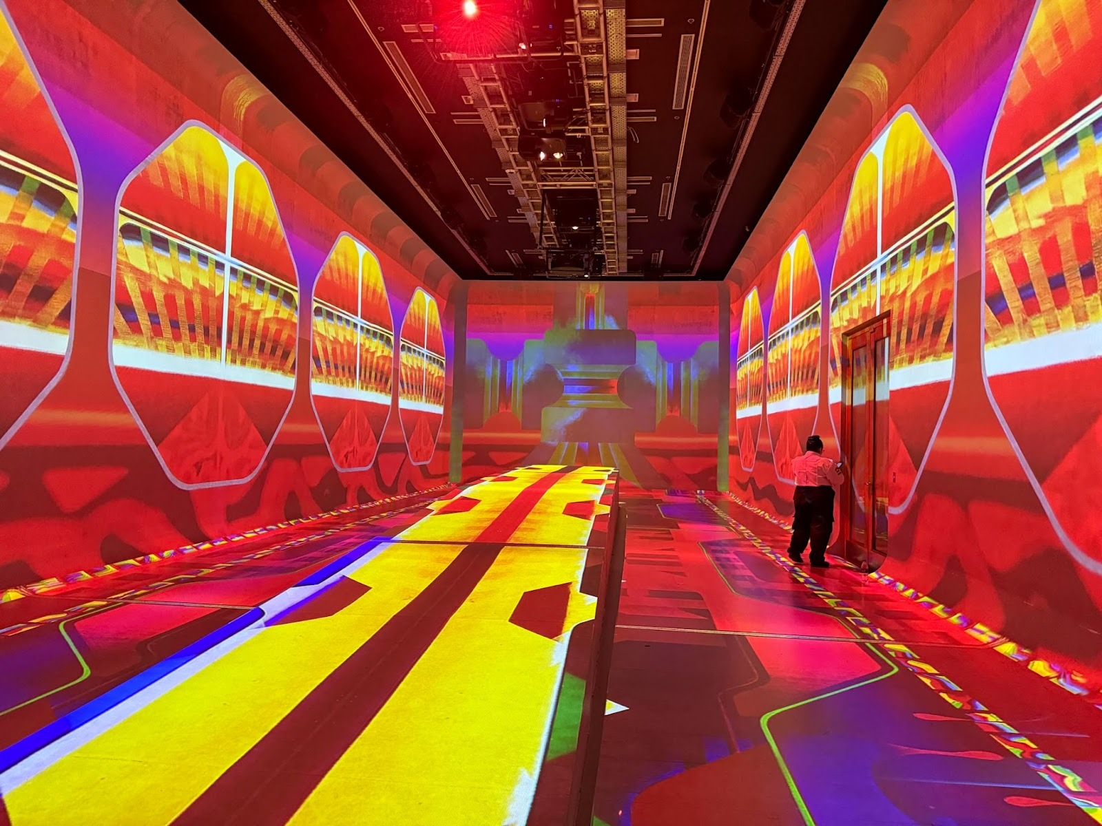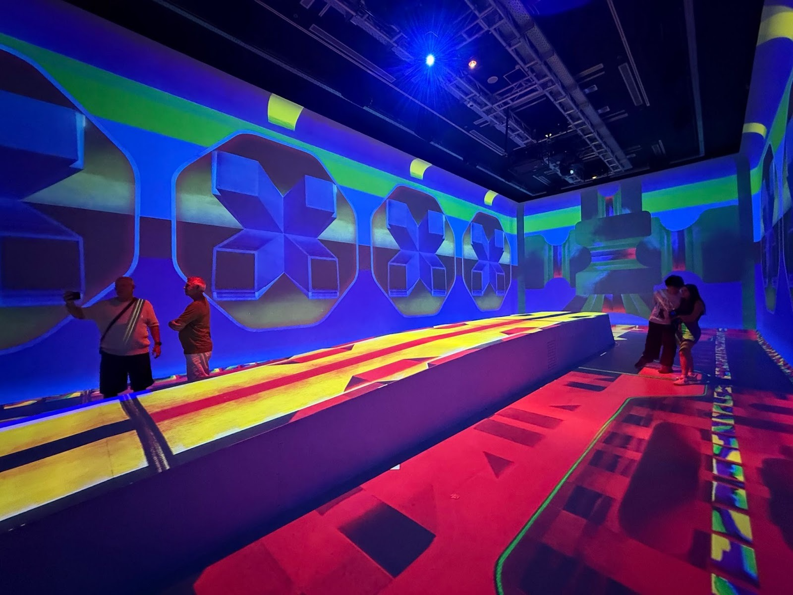 Mi primera parada fue La Pampa Cósmica de Pérez Celis, en el segundo piso. Esta es una videoinstalación inmersiva que transforma la Sala Inmersiva en una cápsula futurista. La obra reinterpreta el período pampeano del artista a través de proyecciones digitales, colores en expansión, símbolos en movimiento y una música expectante que acompaña el viaje.